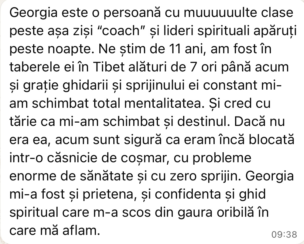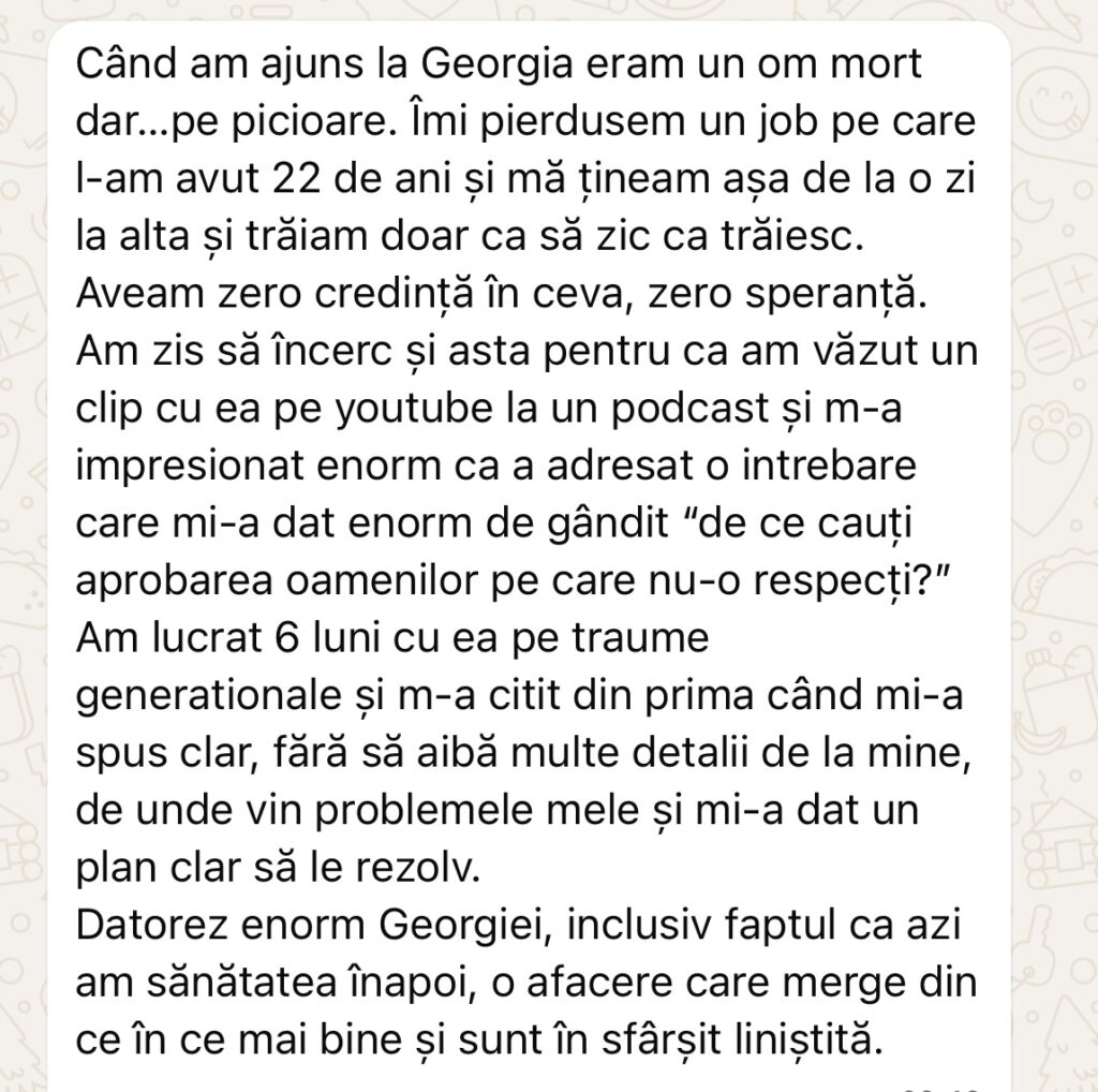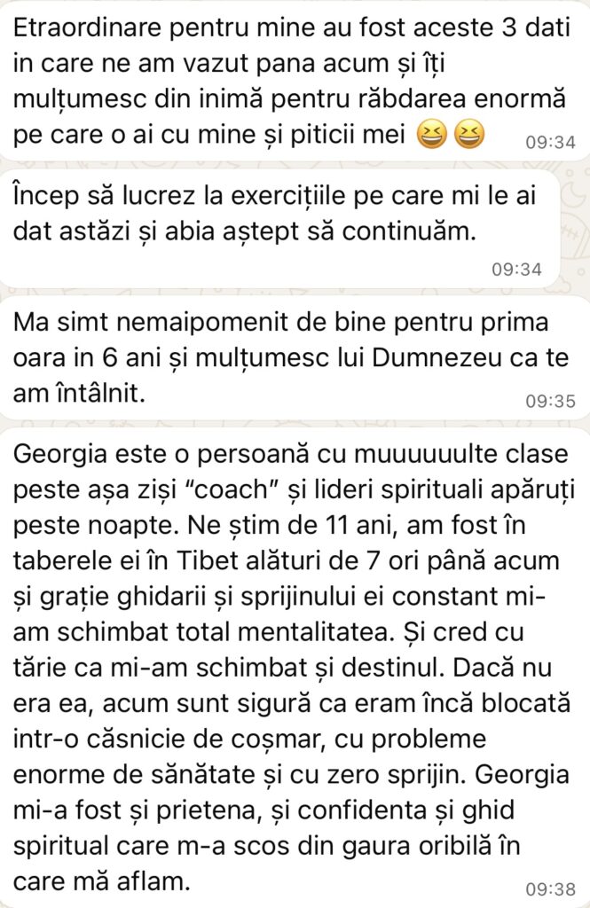 - Repeți zilnic cu Georgia “afirmația zilei” pentru setarea pozitivă a vieții tale, pe grupul exclusiv de Whatsapp, la ora 8.30 dimineața