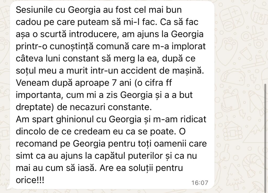Să fie karma ta? Ai făcut TU ceva greșit? Simți că ai fost blestemat sau că primești o răzbunare divină pentru ceva ce n-ai făcut?Cu Georgia identifici cauzele conrete, elimini energiile negative și vindeci traume transgeneraționale. -